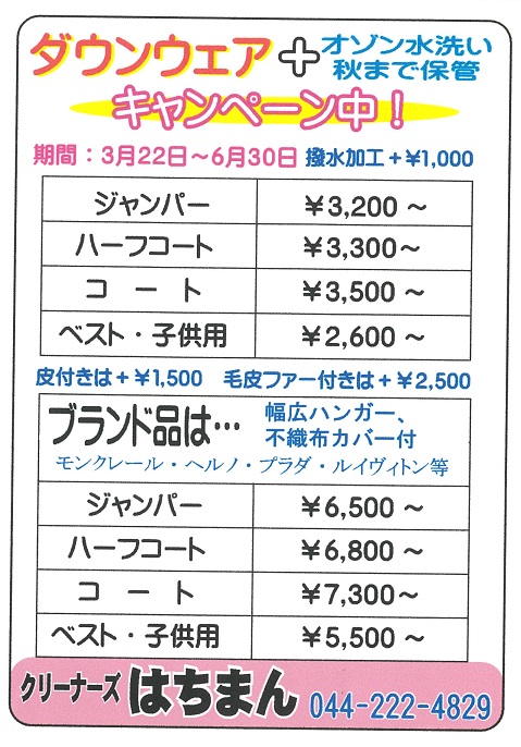 (オシャレシャツ類は別途オプション料金にて即日仕上げも可能です) ・集配は無料サービスです クリーニング師がお伺い致します。 定期集配、スポット集配共にお客様とのご相談となりますのでお問い合わせお待ちしております。 夜間集配はおこなっておりません。 ・洋服類、セーター(アルパカ・カシミア・etc)は不織布包装です 高級品、特殊品も承ります! 例:毛皮・皮革衣料,着物、ドレス,コスプレ衣装,カーテン,じゅうたん,ふとん,ぬいぐるみ,鞄,靴,バッグ,高級ブランドのダウンジャケット,ゴム引きコートなど ムシューダ防虫カバー販売始めました オーバー用330円 コート用220円 マイルドふきん1枚200円 撥水加工(オゾン水洗い),防虫加工(布団類),防炎加工(カーテン類)なども受け付けておりますのでご相談ください。 ・保管サービス受付中 羽毛布団、羽毛ジャンパー等の保管はご相談でございます。 ・お洋服直します 丈ツメ、丈ダシ、ウエスト直し、チャック取り替え。 ニット製品は受付できない物もあるのでご相談ください。 営業時間:平日8時30分~19時30分、日曜・祝日9時~19時 定休日:木曜日 ドライ品、ウエット品は全て手仕上げです・ドライクリーニングは毎回蒸留の新液洗いです。・ウエット洗いは専用洗剤で洗います。 ・羽毛布団、じゅうたん、羽毛ダウンコート、羽毛ジャンパーはオゾン水洗いです。 ・オシャレ着洗いはソフト洗いです。 ・お気に入りのシャツは全て手仕上げです。 ・ポケット掃除、全体のシミチェック、品物別の洗い方に注意しています。 ※お客様とのエピソード※ 別のクリーニング店で取れなかったゴワゴワ感が無くなり、汗などの臭いも取れサッパリしたと喜ばれました。 カウンターでの対応も感じが良かったとお言葉を頂戴致しました。 ![]() ![]() ![]() ![]() ![]() |